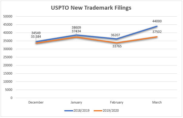One might expect that reduced budgets would mean an immediate pull-back, and that trademark establishment and marketing activity would come to a halt as brands and entrepreneurs put on hold trademark fillings until the COVID-19 crisis ends. Does the data from PTOs support this?