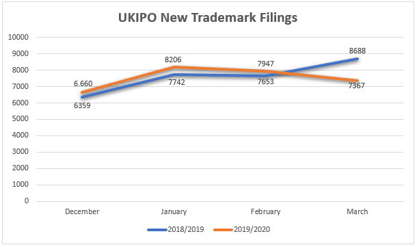 According to the number of new trademarks filed at the UKIPO, the start of 2020 saw the continuation of a broad trend for increased activity on the previous year. The monthly increase on the figures from December to February (approximately 5%) was likely the continuing impact of Brexit, resulting in broad swathes of new applications. However, as the situation with COVID-19 became more widely reported in the UK and across Europe, there was a marked drop in activity (-15% on March 2019).