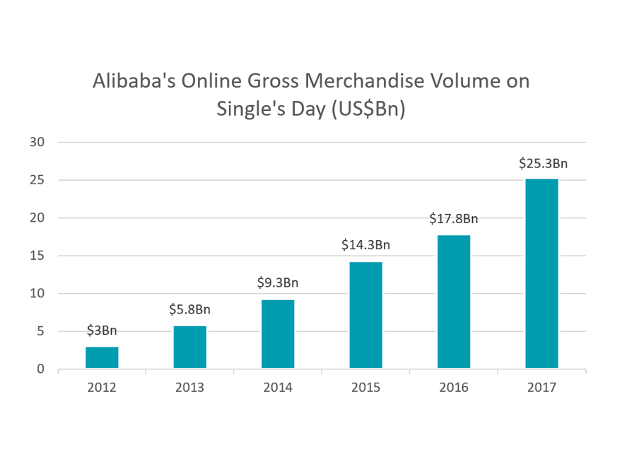 El Día de los Solteros es el fenómeno del comercio electrónico chino que ha ganado popularidad en los últimos cinco años. Aunque esta festividad se celebra desde 1993, no ha sido hasta que Alibaba se ha implicado de lleno que hemos visto un crecimiento espectacular de las ventas. De los 3.000 millones de dólares de ventas en 2013, el año pasado se batieron récords de ventas de comercio electrónico al registrarse más de 25.000 millones de dólaresy se prevé que 2018 lo supere. Para proporcionar un marco de referencia en torno a la escala del Día de los Solteros, el Black Friday y el Ciberlunes (los equivalentes occidentales más cercanos) lograron la mitad de ventas combinadas en 2017, mientras que el gigante del ecommerce Amazon solo alcanzó los 2.400 millones de dólares en ventas durante su "Prime Day".