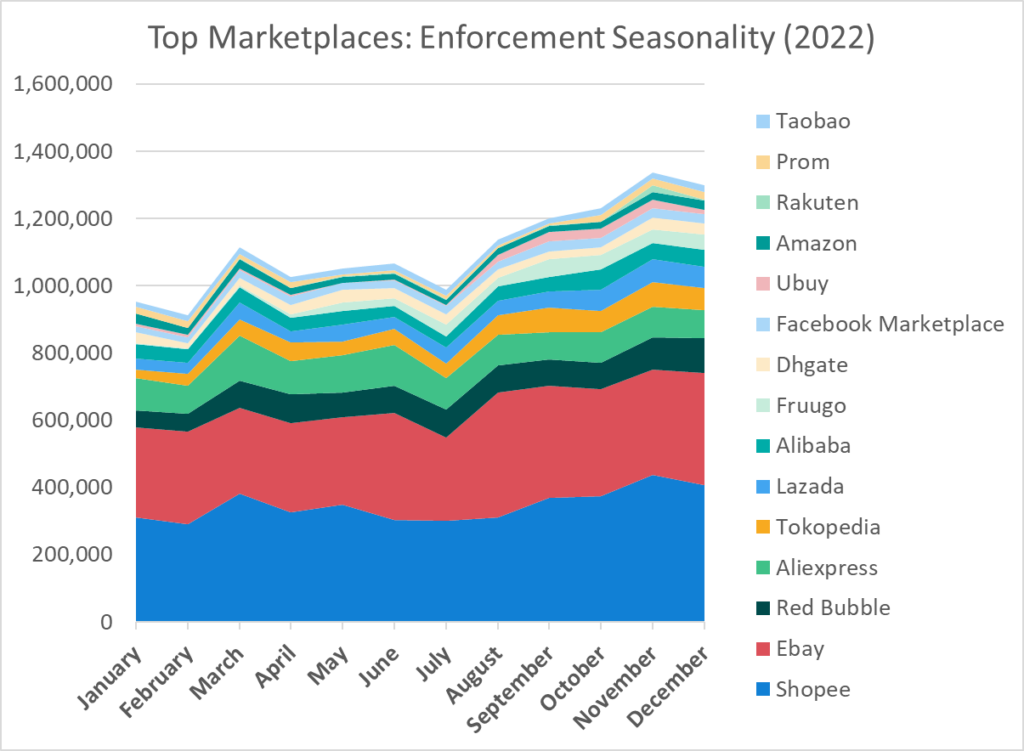 As shown in the graph below, Shopee, eBay, and Red Bubble see the highest volume of enforcements. During the Golden Quarter, there is a clear spike in enforcement volume for all marketplaces listed.